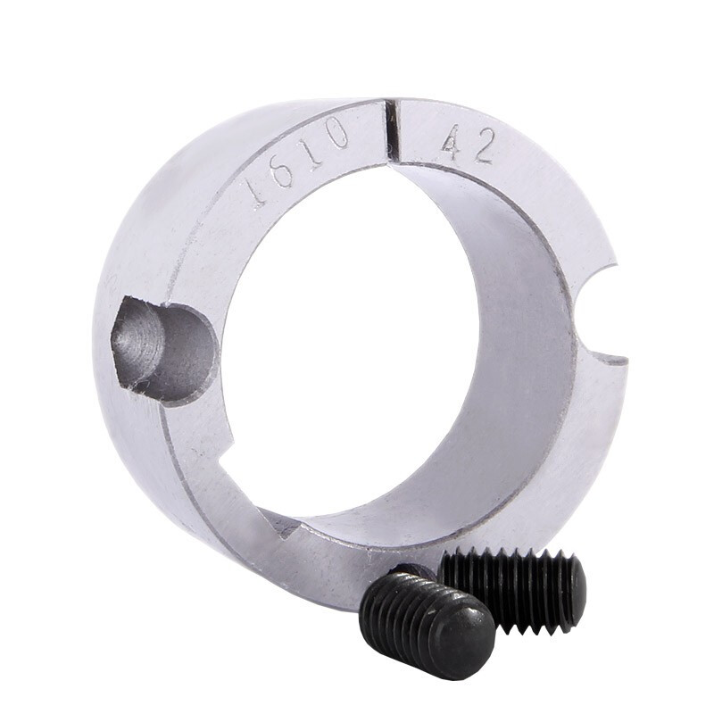 Die Taper-Buchse ist ein Verbindungselement mit konischer Grundform und einer Passfedernut zur einfachen und schnellen Fixierung von Antriebselementen wie z.B. Keilriemenscheiben oder Kupplungen mit einer Welle.